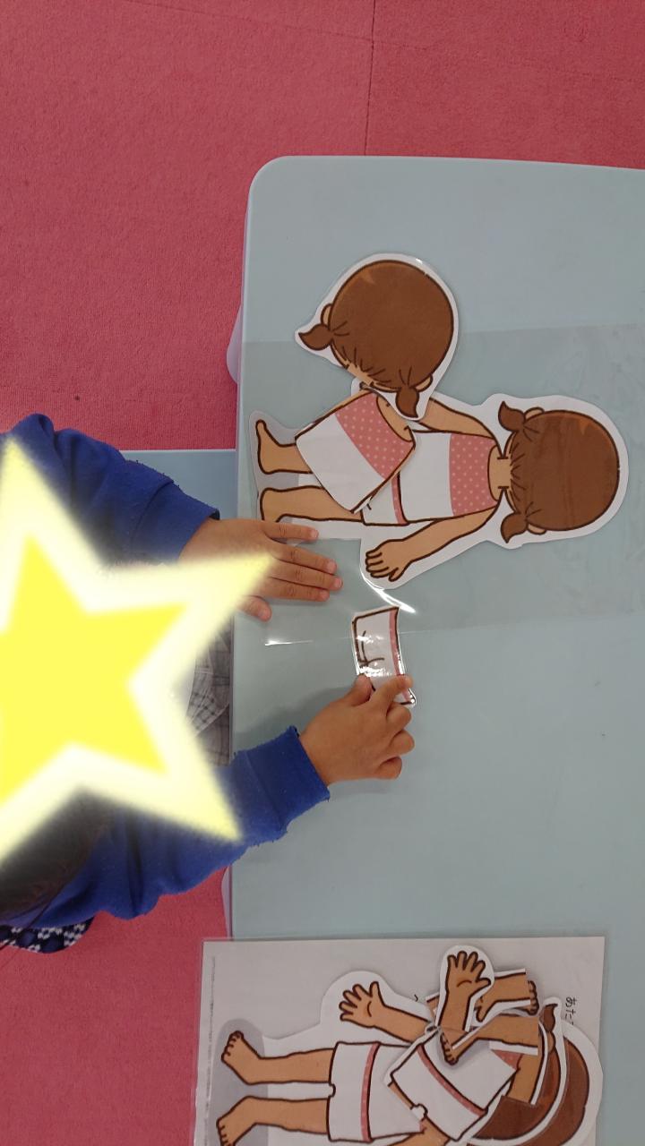 スーパーの袋を使って凧を作りました。どれを貼ろうかなあ…と悩むかわいらしい姿が見られました(^^)