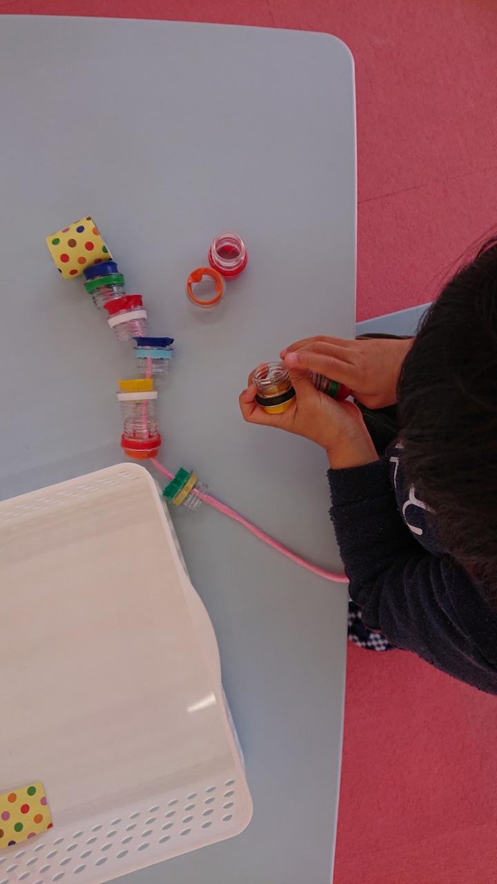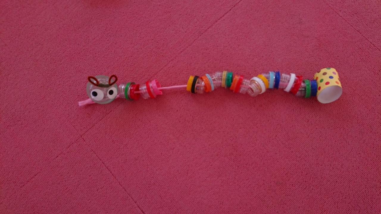 ロープにペットボトルの上部を切った物を通して作りました。