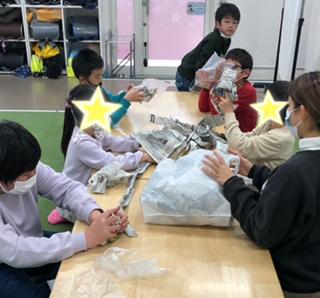 本日、工作プログラム、「新聞で何作る」では、新聞紙、ビニール袋、輪ゴムを利用して取り組みました!