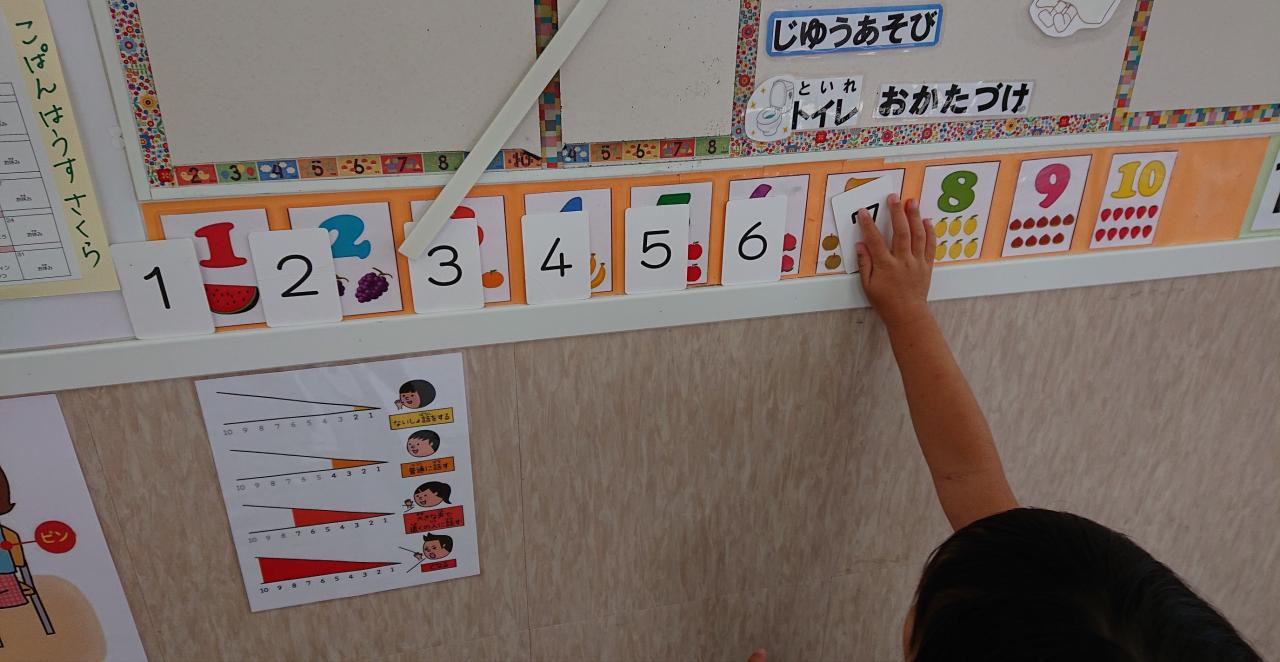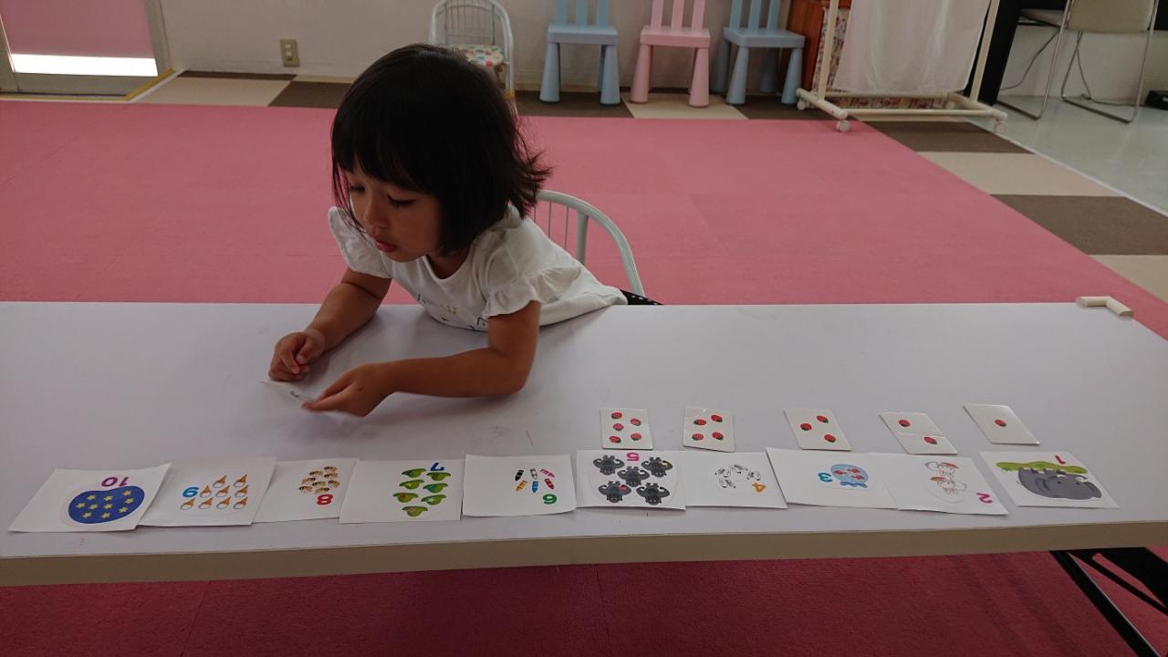 数字カードの絵の数を指で1つずつ確認したり、壁にある数字と同じカードを並べたりしました。