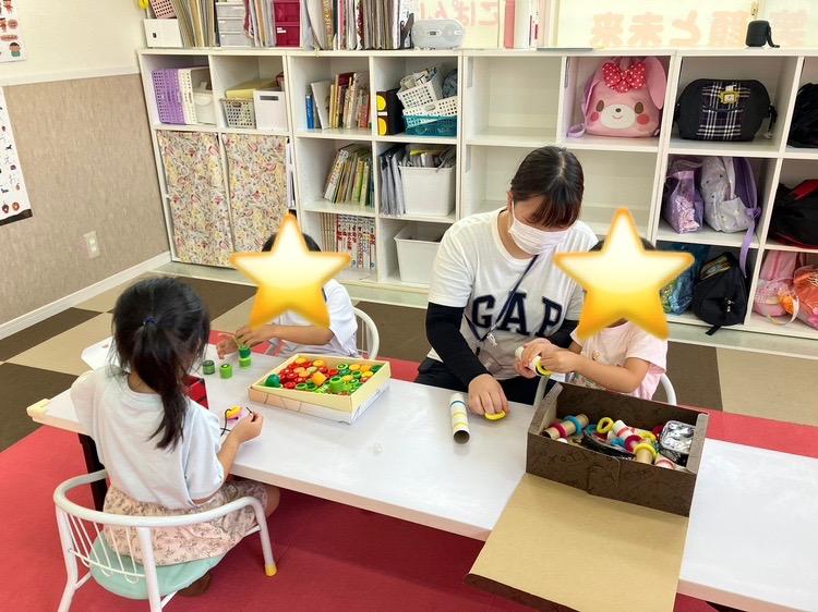 年少、年中組は、指先を使い紐にドーナツを通したり、筒にゴムを通したりしました。
