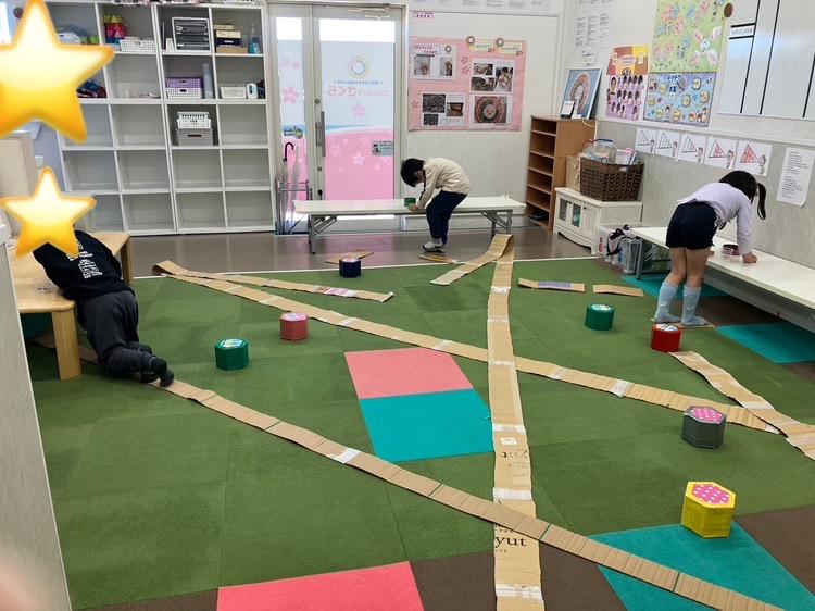 ダンボールとヘキサゴンを使って迷路を作り、落ちないようにゴールまで行き、宝物(おはじき)を取り数を数えて喜び合ったグループ。