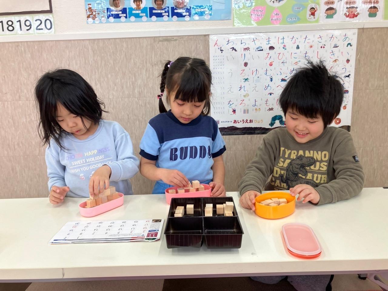 友達と一緒に積み木の数を数えたり、集中して平仮名を書いたり、みんな頑張って取り組みました(*´∀`*)