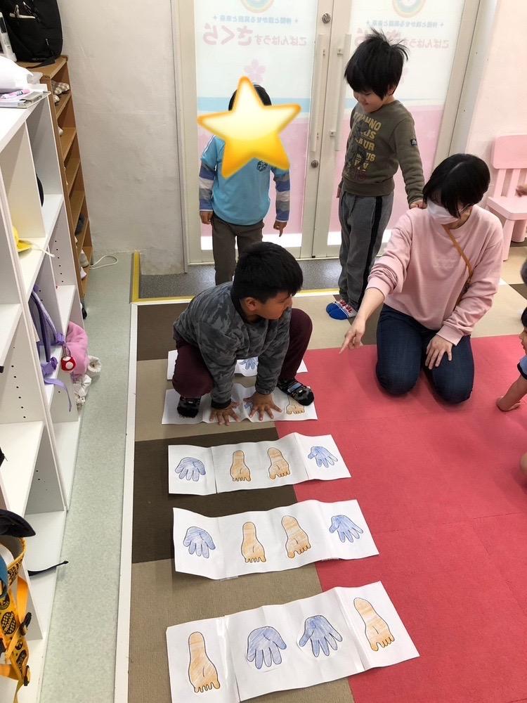 その後は、ハンカチ落としをしたり手や足のマークに合わせてバランスをとりながら体を動かして遊びました♫