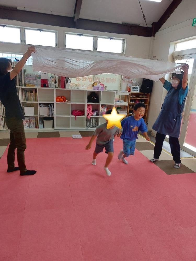 今日は、グループにわかれて、シーツや毛布を使って遊びました。