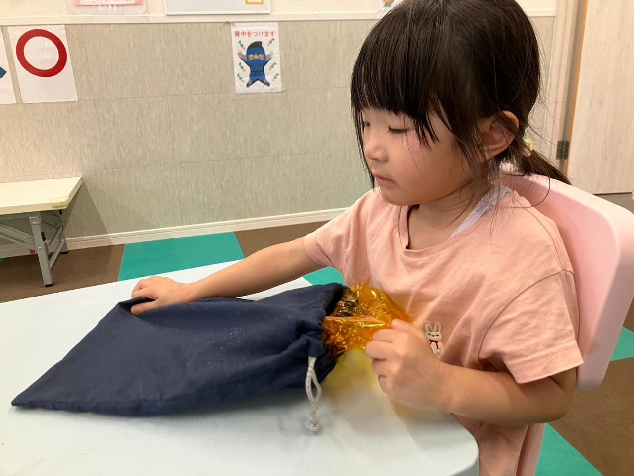 今日は、2つのグループに分かれて普段身近にあるビニール袋や綿、コップ、ボールなどの感触を楽しみました。