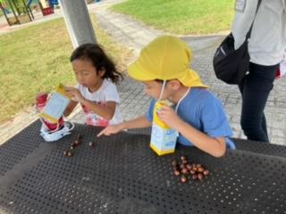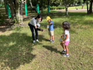 と大きさや色の違うどんぐりを見つけて喜んだり、拾ったどんぐりの数を数えたりしながらそれぞれどんぐり探しを楽しみました☆