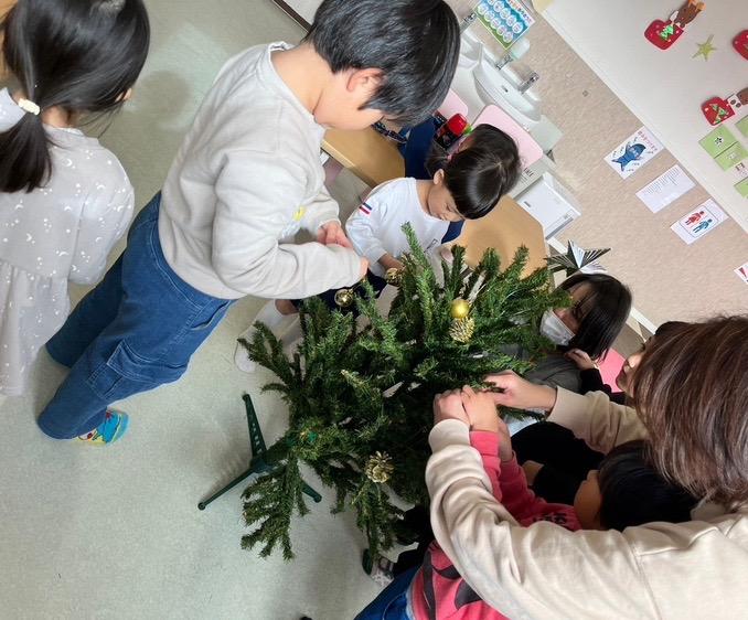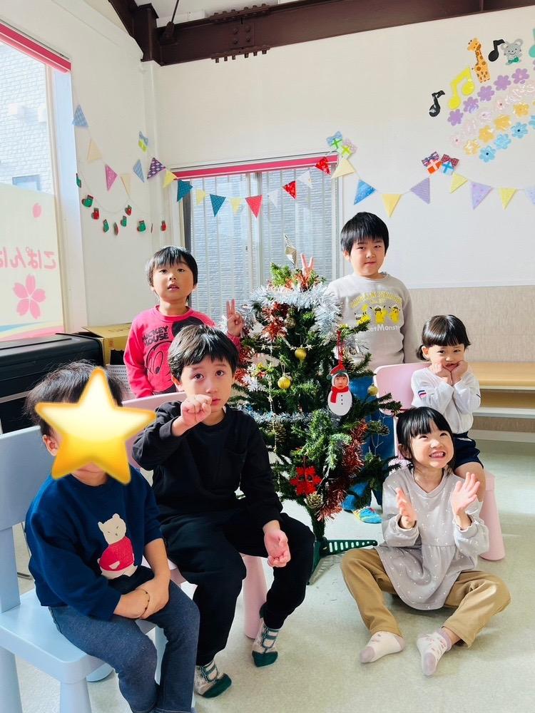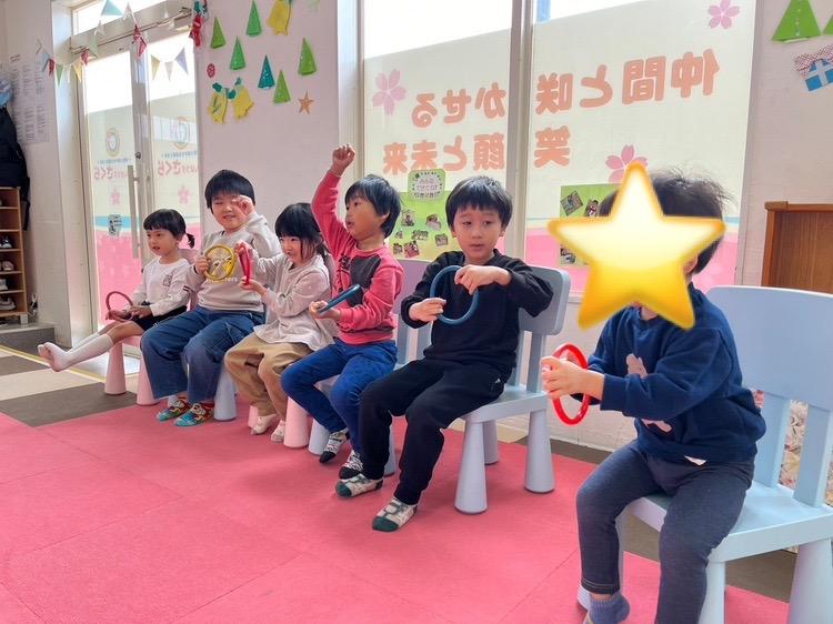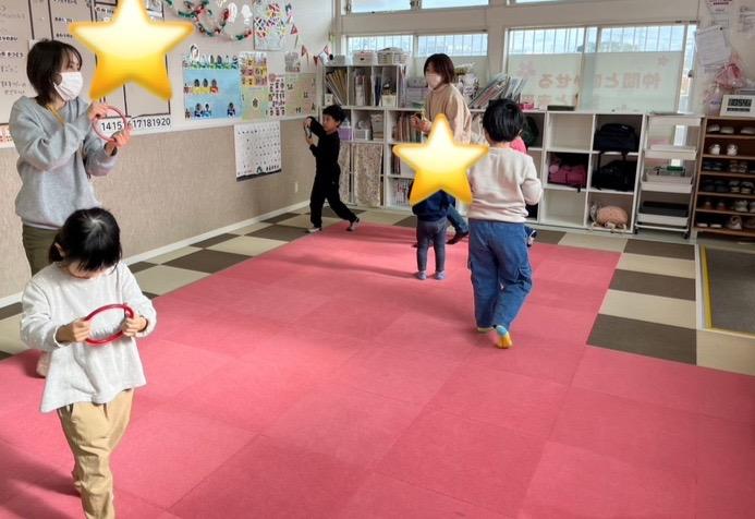 ハンドルに見立てた輪を持って、みんなでバスごっこの音楽に合わせて体を動かしました
