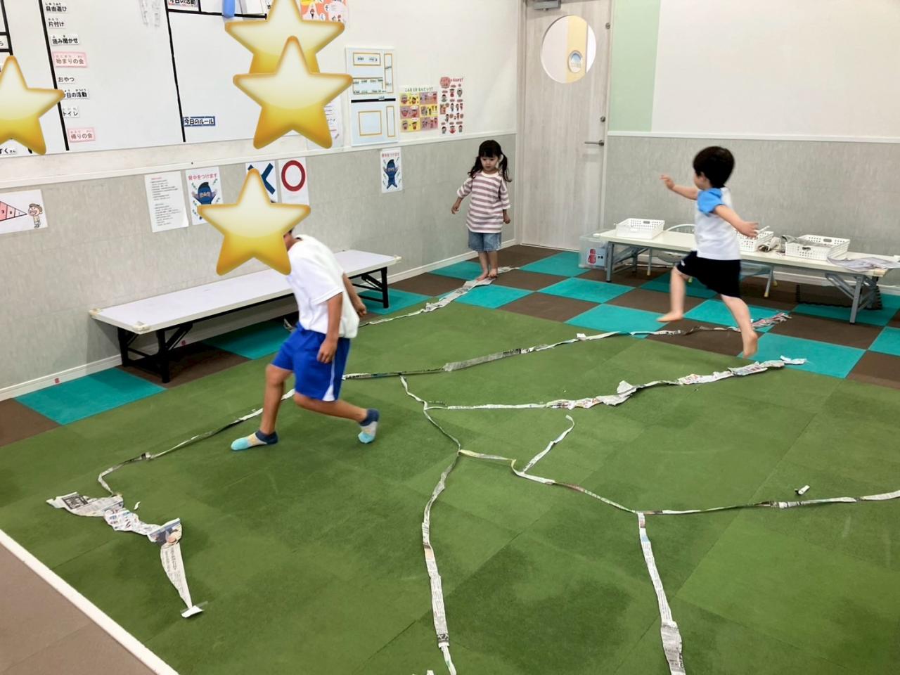 大きい子たちは破った新聞紙で迷路を作りました