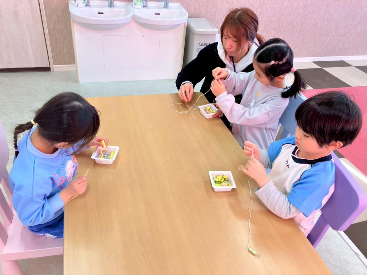 作ったビーズを、紐に通したり、ちぎった折り紙をくっつけたり…