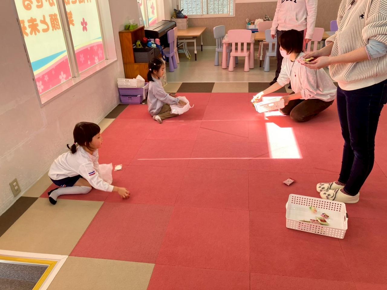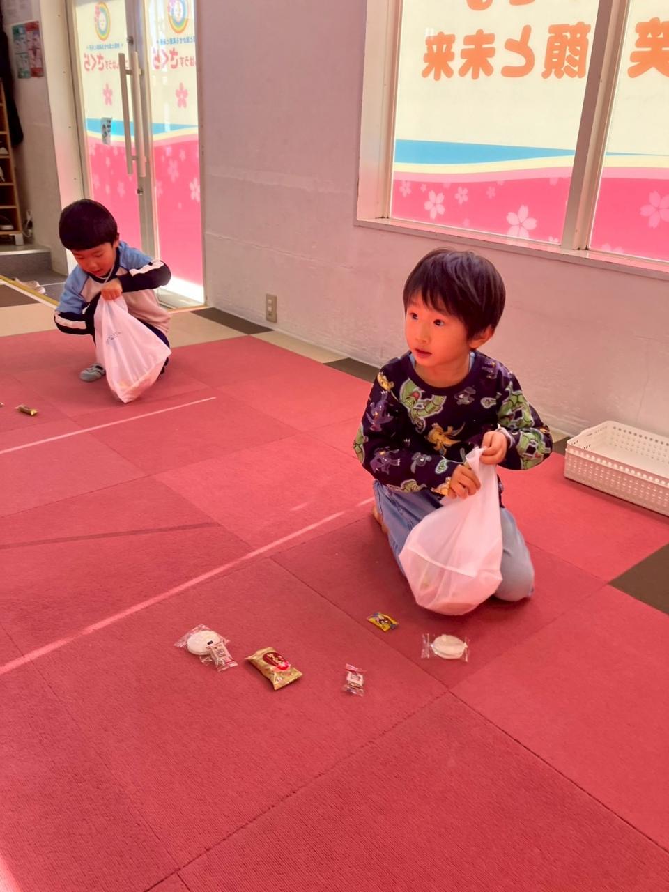 作った新聞紙豆とカラーボールで鬼退治をしたあとは、お菓子まきです☆