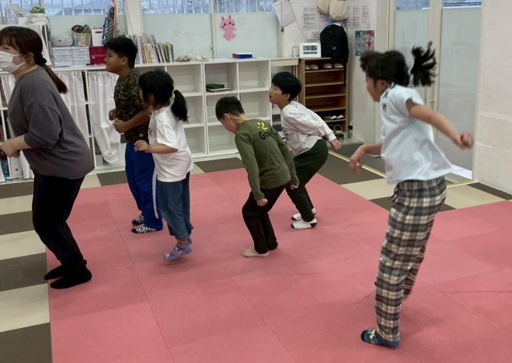 今日のプログラムは前に立つリーダーの指示をよく聞き、「右」「左」「前」「後ろ」といった方向の命令に合わせて、みんなで両足ジャンプで移動します。