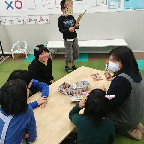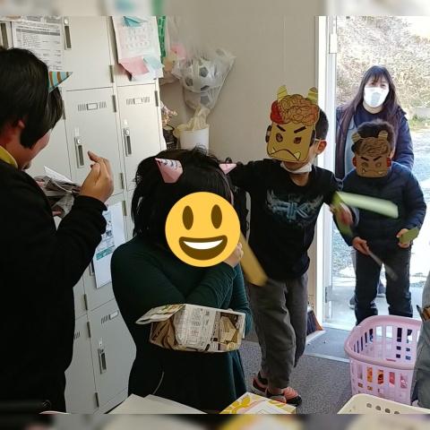 最初に豆をいくつ食べたらいいか等、お話しを聞いてから、鬼役のお友だち、投げるお友だちにわかれてやりました(⌒0⌒)