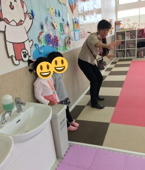 まずは地震が起きた時に、照明やガラス窓、棚の近くからすぐに離れて、壁に背中をぴたっ!とくっつける訓練★