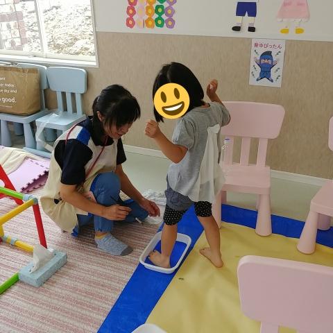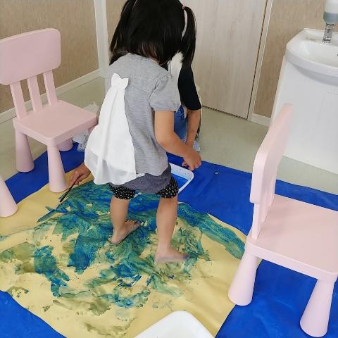 水と混ぜた絵の具に足をつけてペタペタ、どんな風になるか楽しみだね(*^^*)