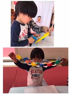 さくらっこタイムでは、クリスマスの飾りで輪っか作りをしています!