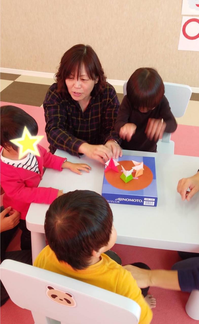 空き箱を土俵にして、おすもうさんを折り紙で作ったら、箱をトントン叩いて、「はっけよーい、のこった!のこった〜」
