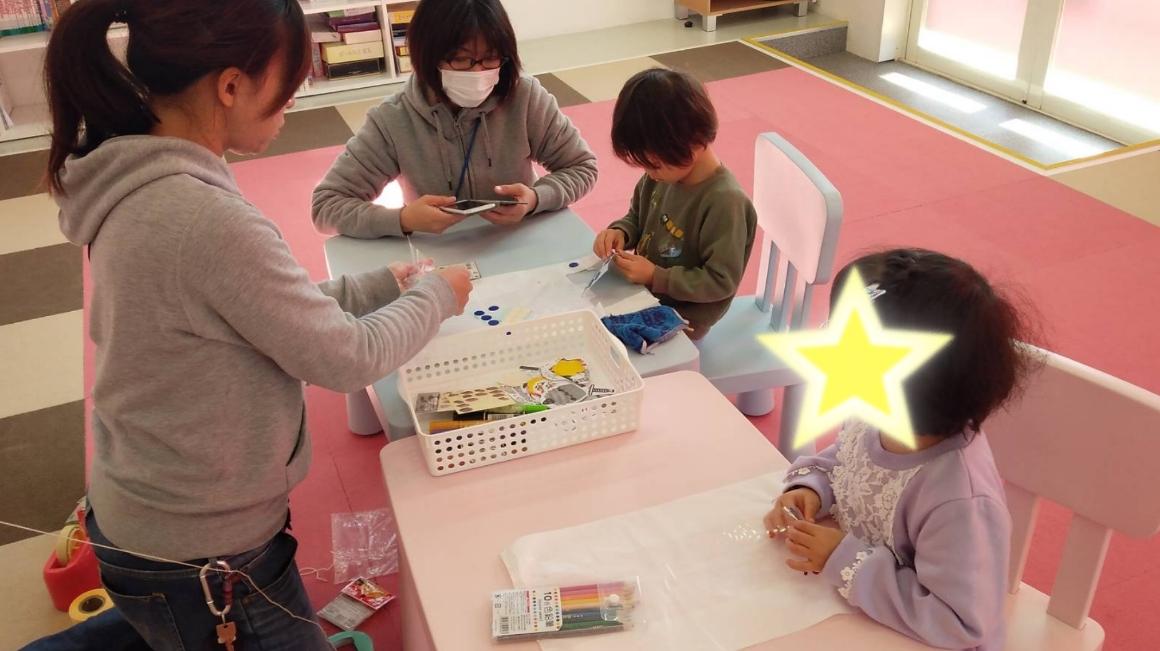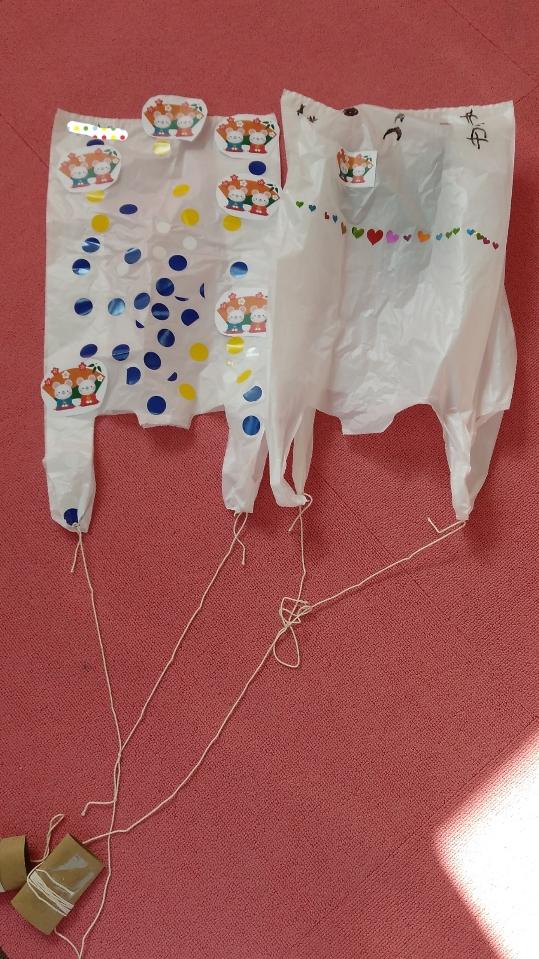 ビニール袋に自分で好きな飾りや絵を描き、凧糸を付けたら完成♪