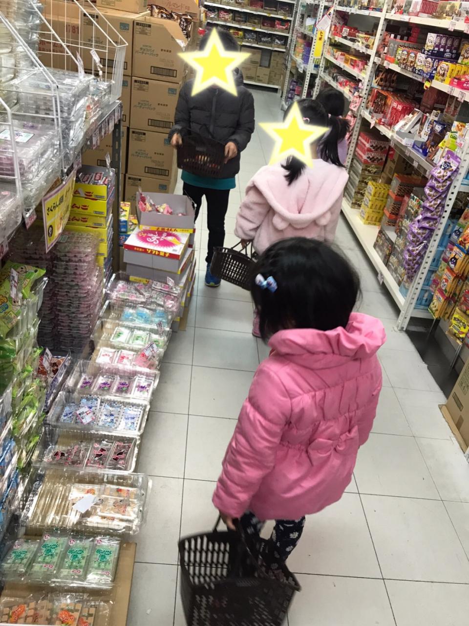まずは近くのお店へお菓子を買いに。