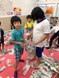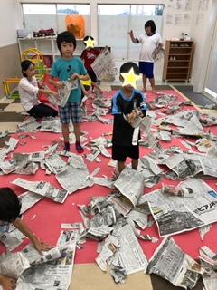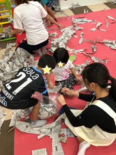 たくさんの新聞紙をみんなでビリビリ‼︎