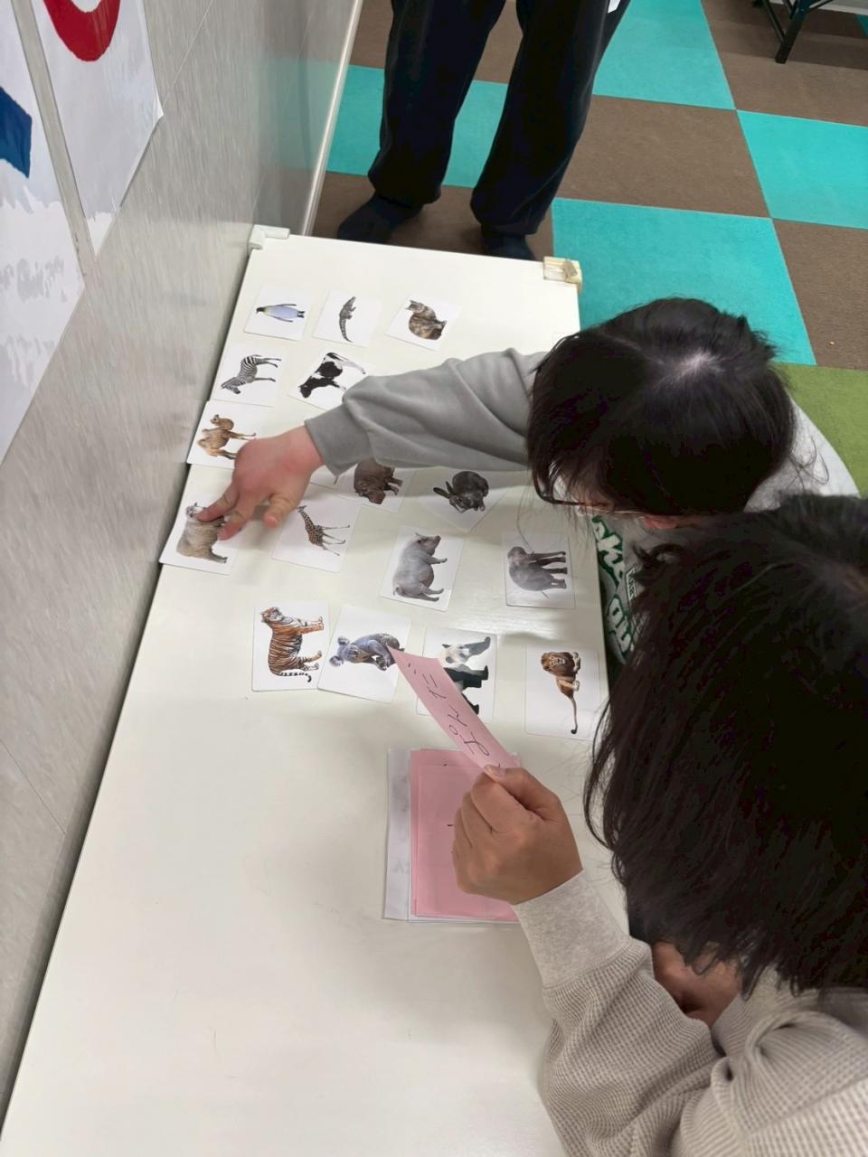 今日のプログラムでは、プリントに書かれた文字を読み、言葉の意味を理解し、どれがちがう仲間なのかを考えました。
