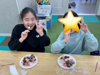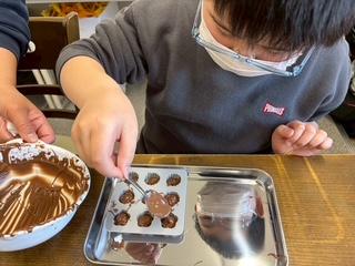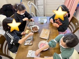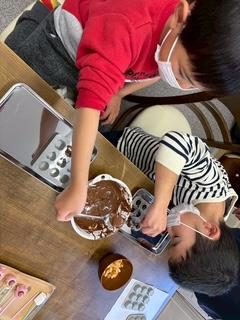 チョコを型に流し入れて、クッキーをさしたり、マシュマロにチョコをつけて飾りをつけたり…