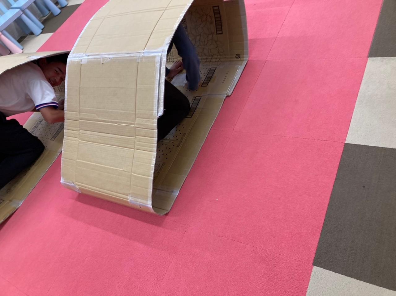 2チームに分かれて1人ずつ順番に段ボール上を歩き