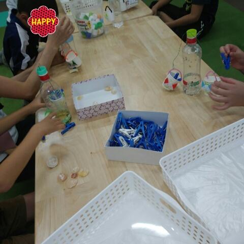 貝殻、ペットボトルの蓋、洗濯バサミなどを入れて重さを比べてみたりしました♪