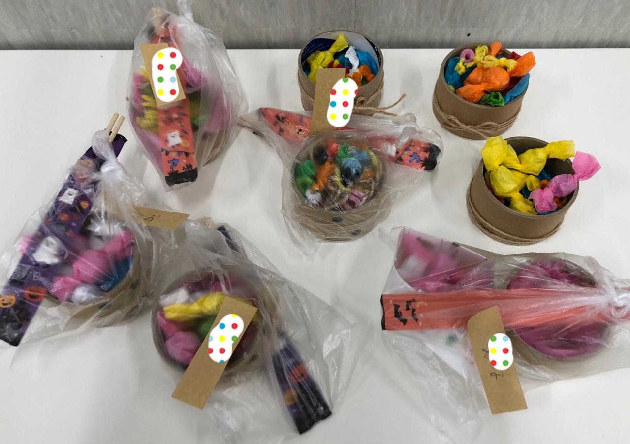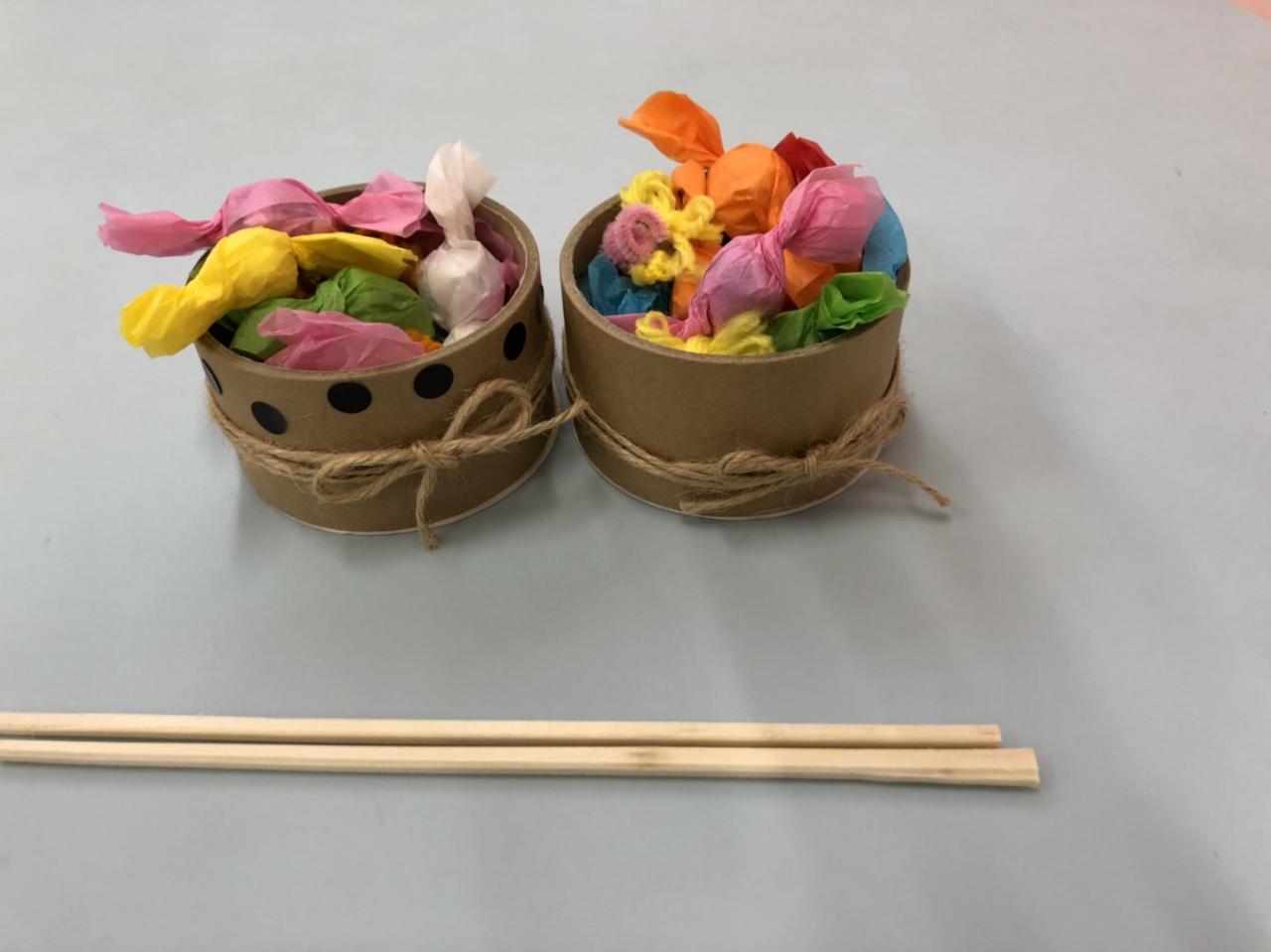 花紙やモールで作ったキャンディをお箸を使ってキャンディBOXへ運んだら可愛いキャンディBOXの出来上がり♪