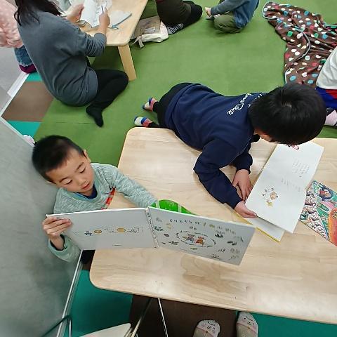 自分で読んだり、お友達と一緒にページをめくったり、せんせいに読んでもらったり、自由に参加しました(^-^)