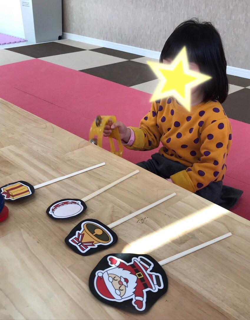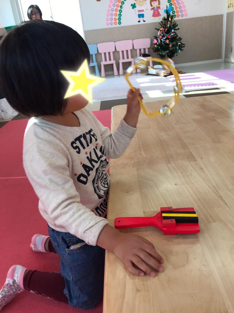 タンバリン、カスタネット、鳴子など、いろいろな楽器を使って、あわてんぼうのサンタクロースを歌いました。
