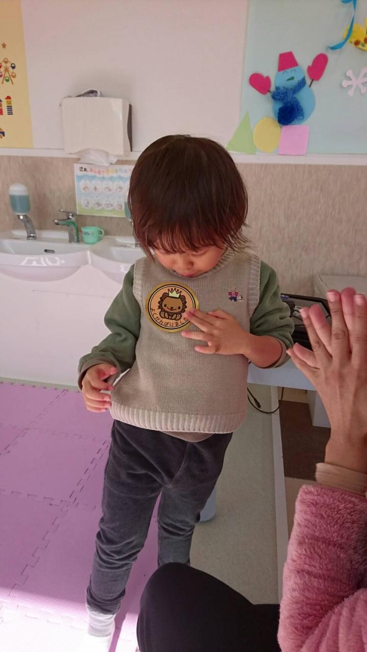 頑張ったご褒美に「よくできましたバッチ」を貼ってもらってご満悦(^^)