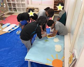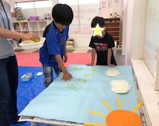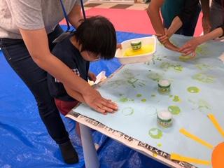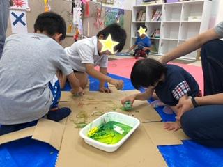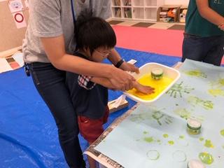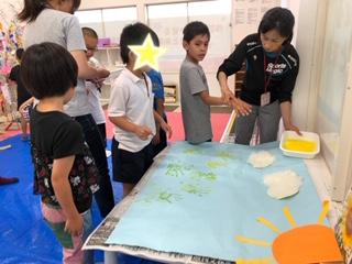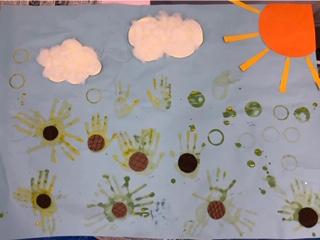手のひらに、黄色のえのぐをつけたら、ペタペタペタ、ヒマワリの完成‼︎