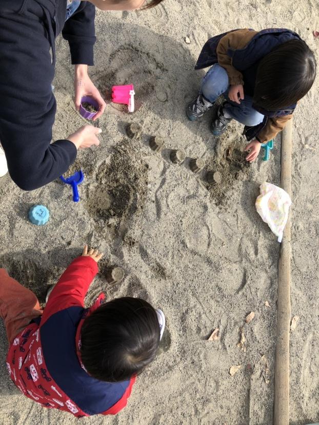 天気もいいので、公園へお出かけ!砂場で砂のゼリーを作り、いくつかな?と数遊びをしました。上手に数えられたね♪