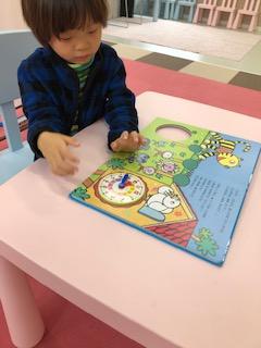 時計の絵本を使って、朝は何時に起きたかな?今何時かな?と一緒に考えながら時計の針を動かしました。長い針と短い針があり難しかったけど、よく頑張りました☆