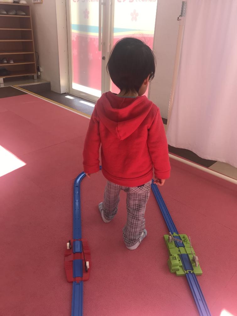 今日のさくらっこたいむは、プラレール!!レールを繋げて、電車をゴー(^^)電車が動いて楽しいね♪