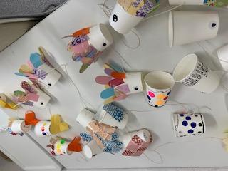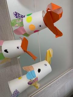 紙コップとタコ糸、色紙を使ってカラフルなこいのぼりができました~