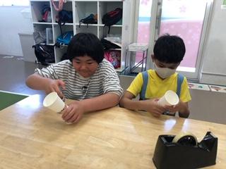 紙コップ、新聞紙、たこ糸などを利用して制作しました!
