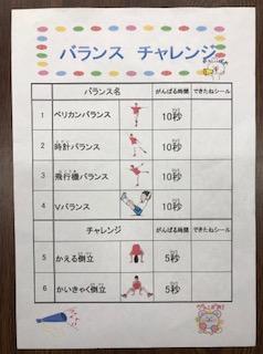 本日運動プログラム、「バランス体操」では、バランスチャレンジシートを利用して取り組みました!