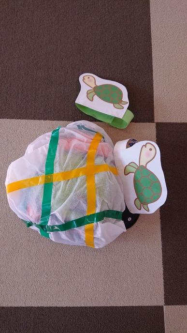 かめさんのお面を付けて甲羅を背負って、大好きなキャラクターまでよういドン!