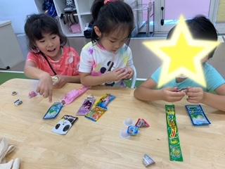 実際に振ってみたり、押してみたりしてきれいなしゃぼん玉をたくさん作ることができました(^^)