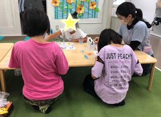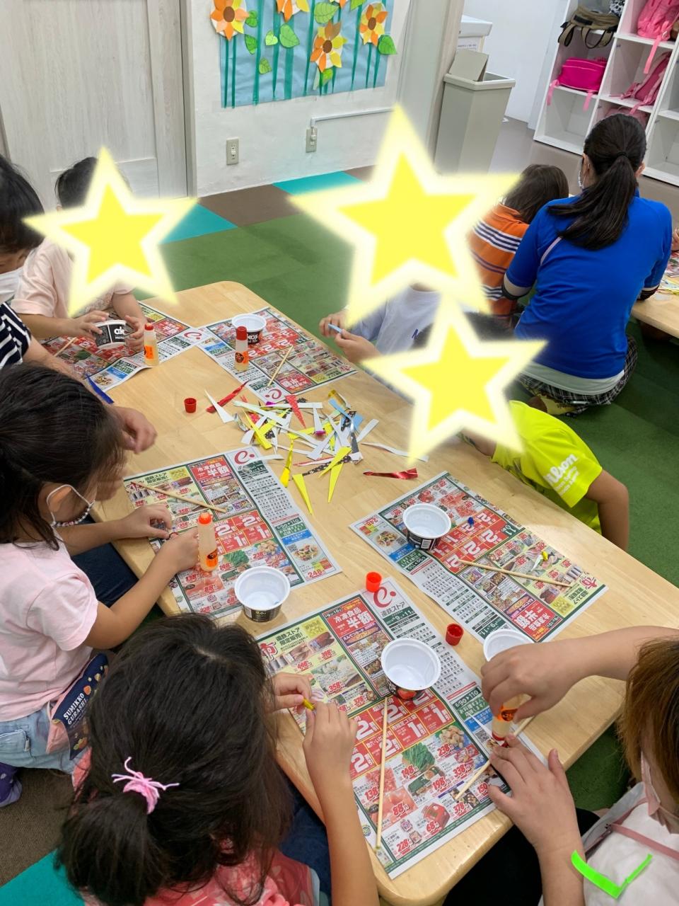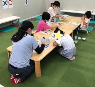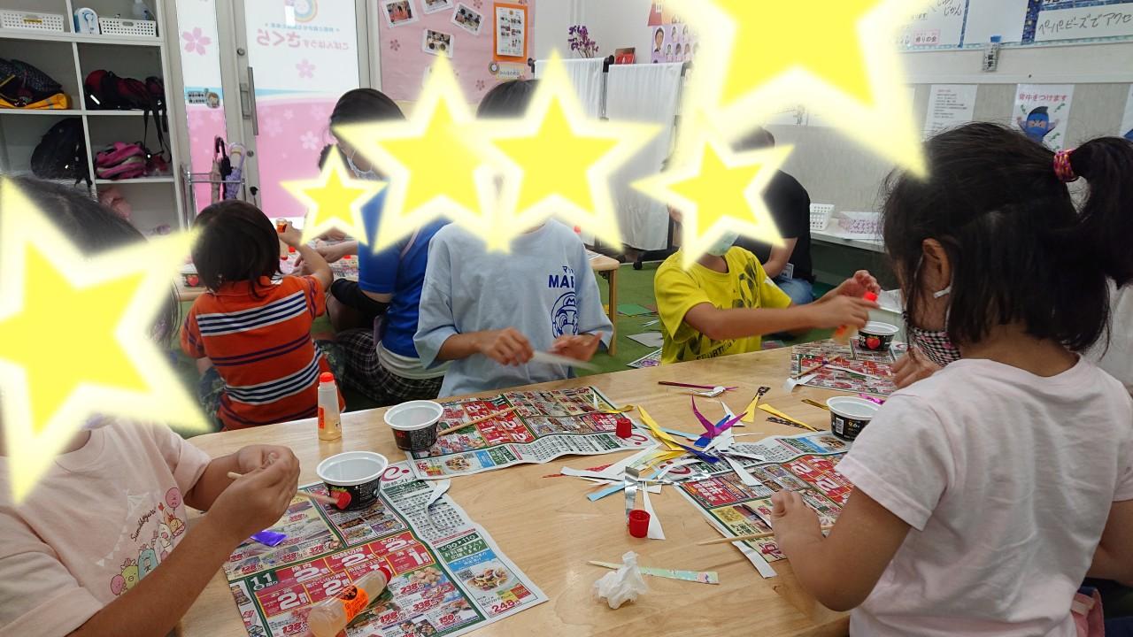 プログラム『水遊び』は雨の為中止になってしまいました。今日は『ペーパービーズでアクセサリー作り』を行いました。