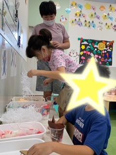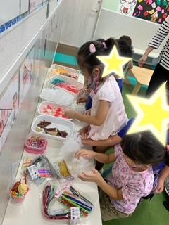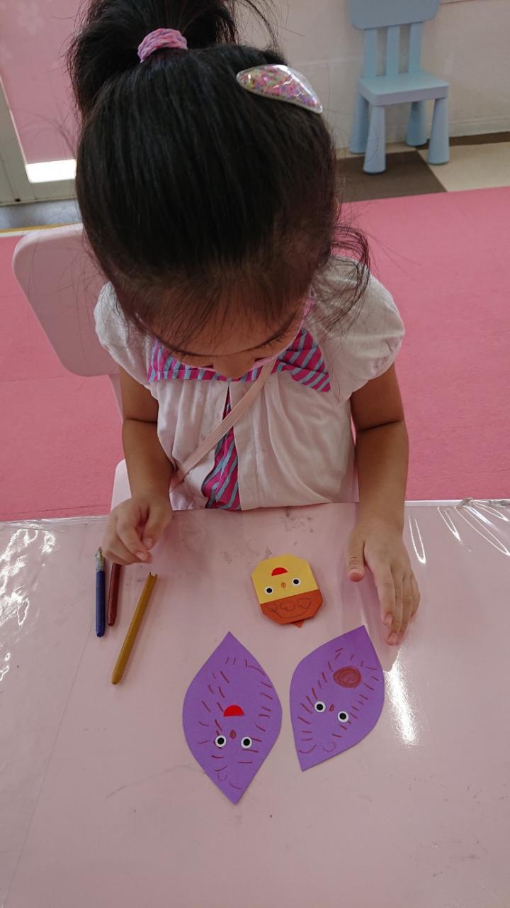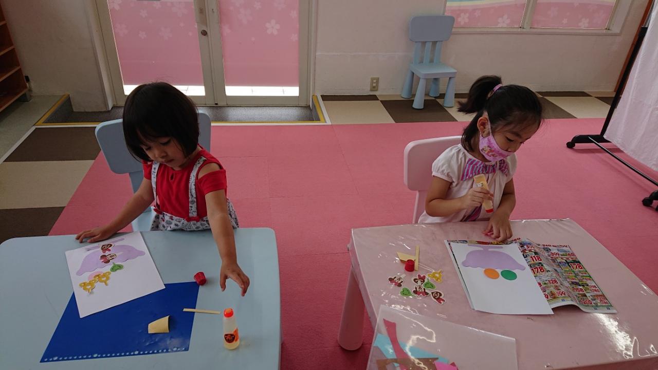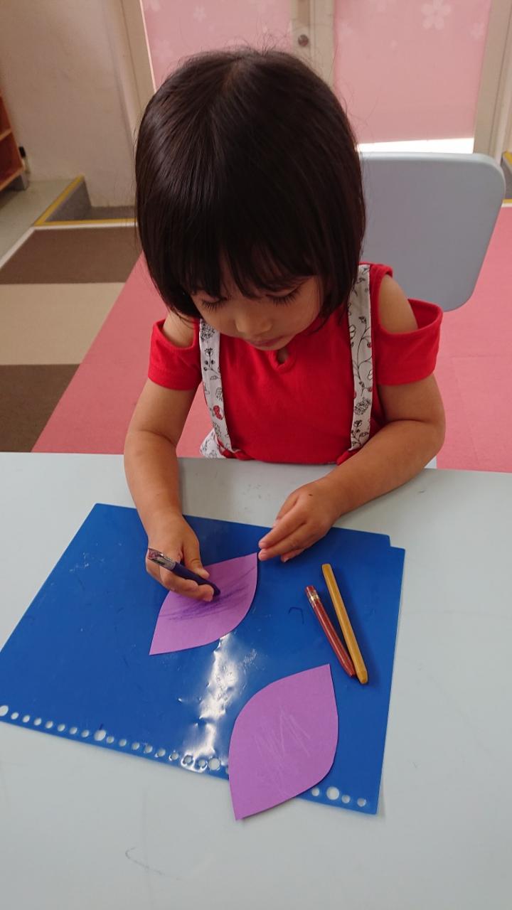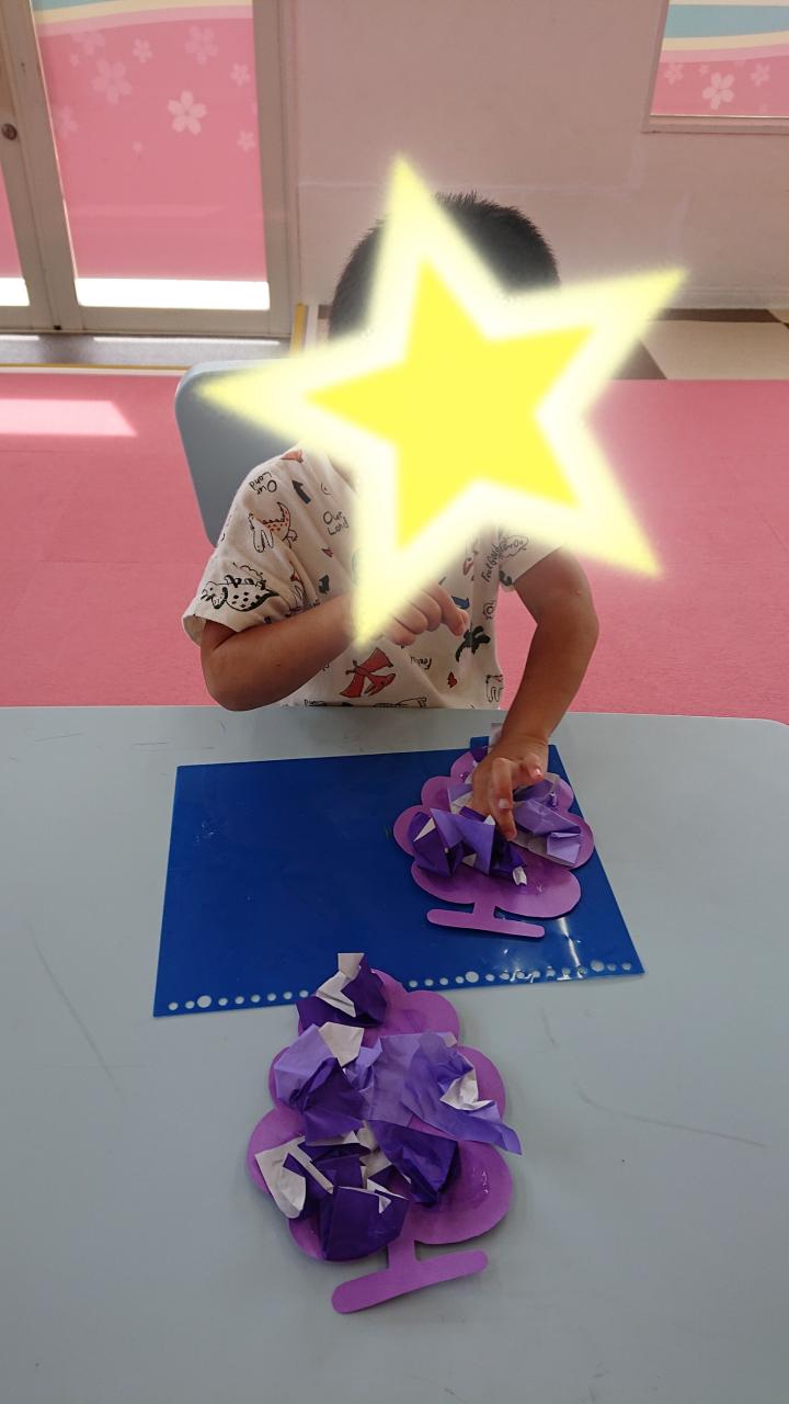 くしゅくしゅポン、とリズムにのってぶどうを製作しました。それから、ぶどう畑を目指して♪歩こう~の歌をうたいながら散歩をしました。