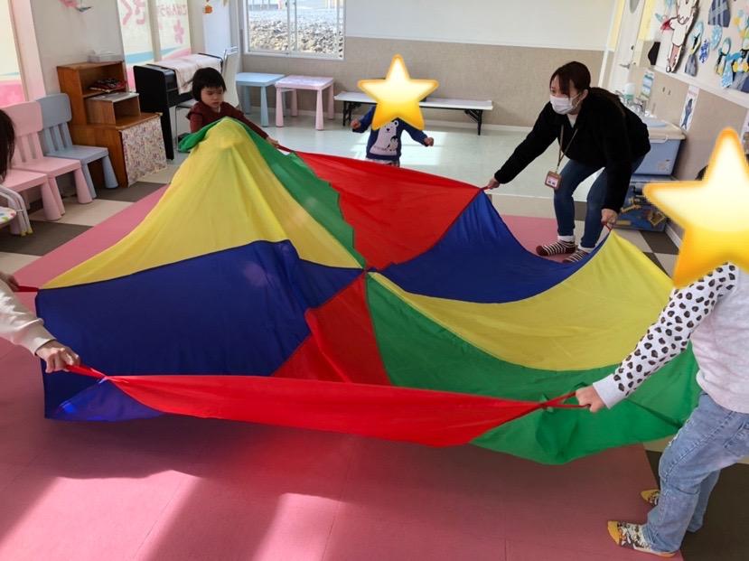 ダンスにチャレンジでは、曲に合わせてパラバルーンを行いました☆