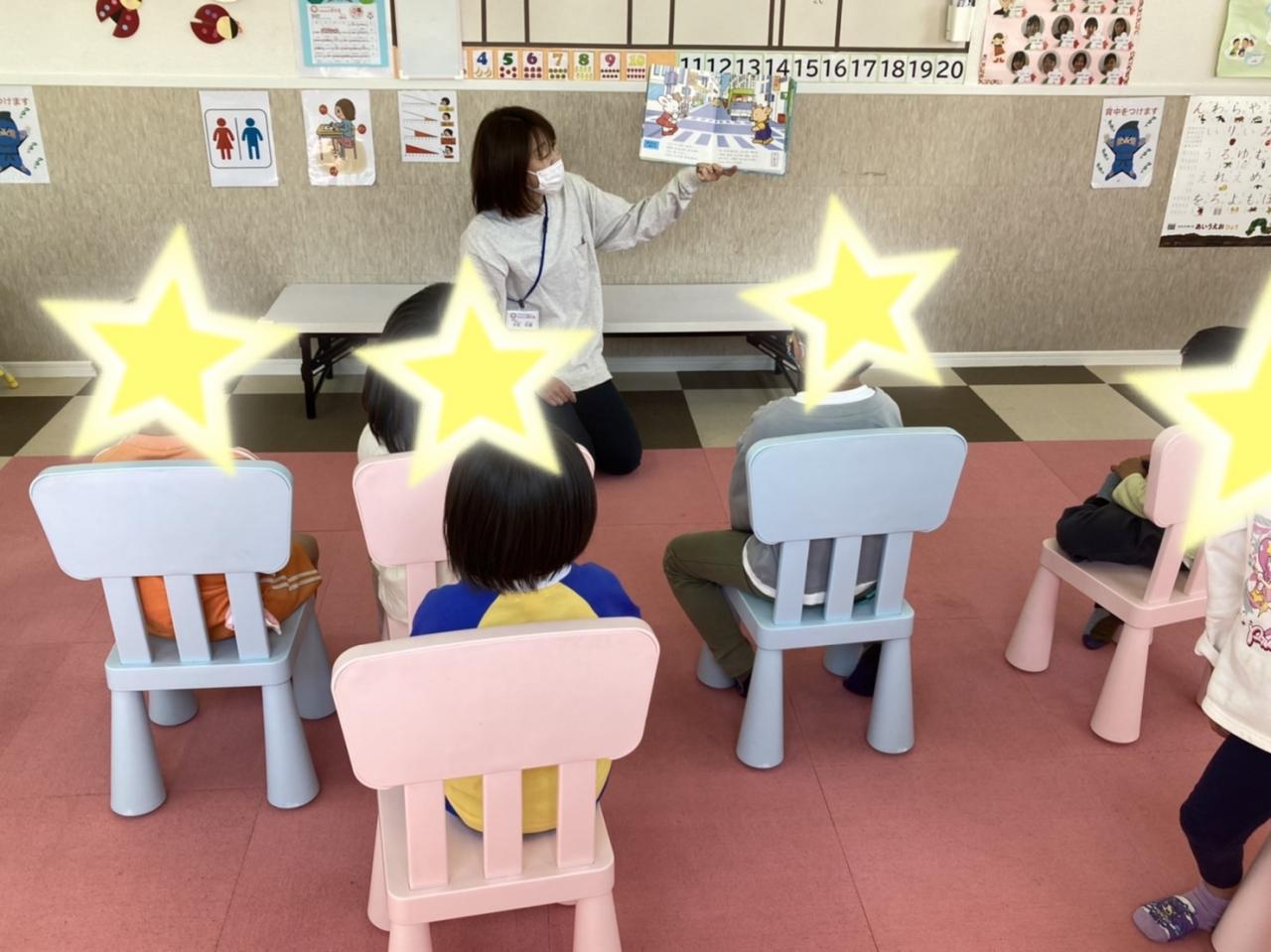 交通安全の絵本を見ました。とても真剣に見て考えることができていました。