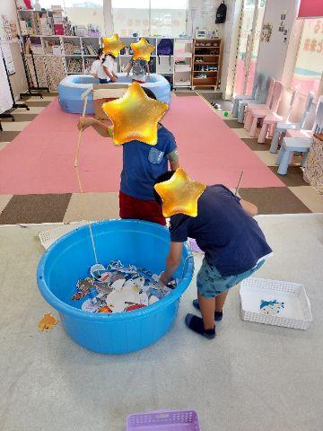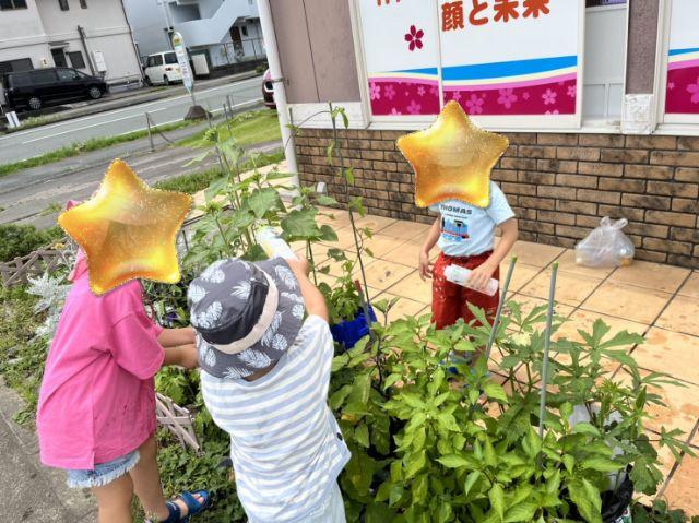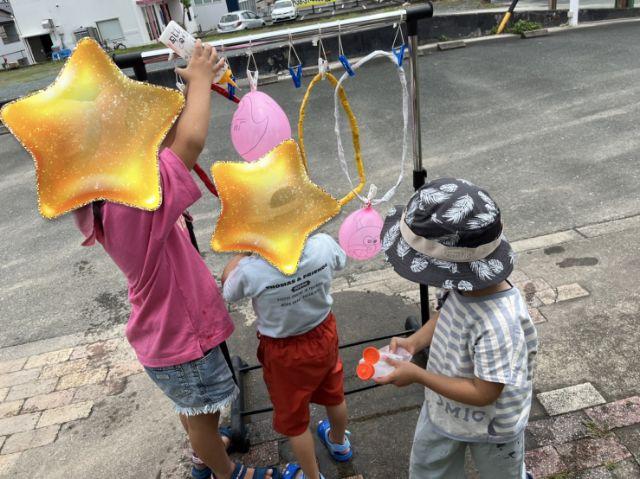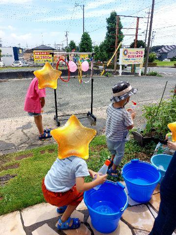 戸外で水鉄砲遊びを楽しみました。水をたくさん入れるにはどうしたら良いかな?どうしたら沢山とぶかな?友達の様子も見ながら考えて遊ぶ姿が見られました(^^)