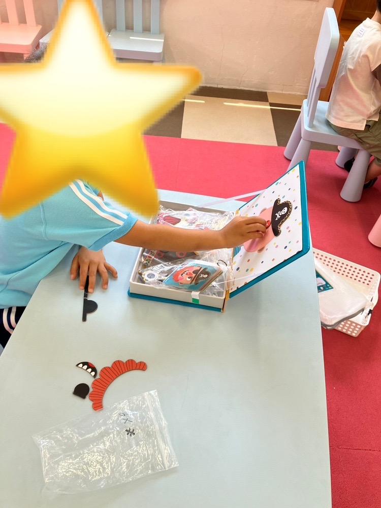 年少組は、見本をよく見て同じ顔を作りました。黒目の位置はどこか等細かな部分までよく見てやれました☆