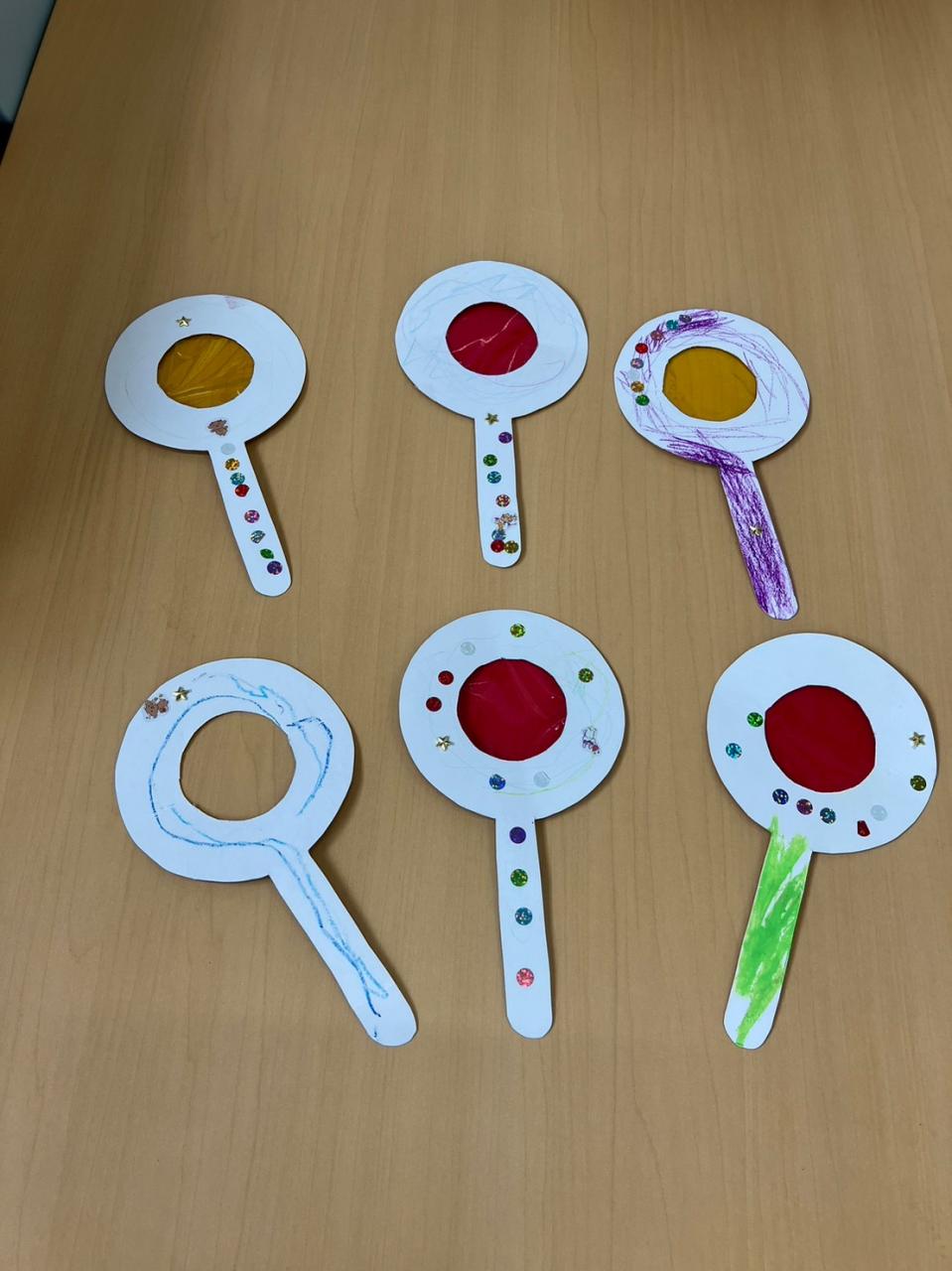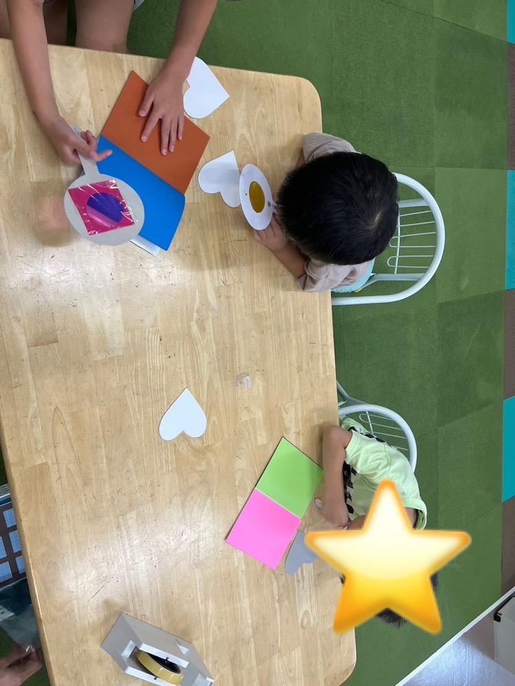 今日は、好きな色のセロファンを選んで、穴の空いた部分にテープで貼って自分の色メガネを作りました☆