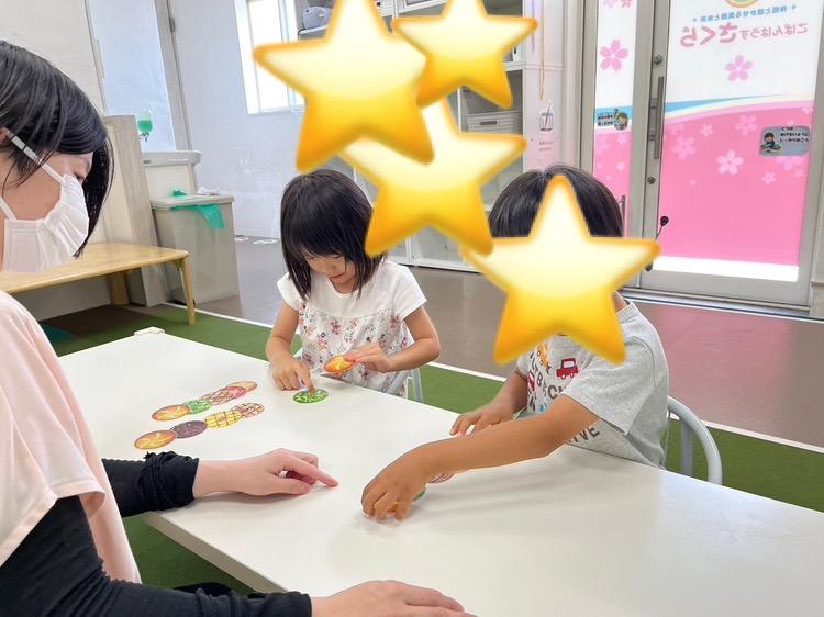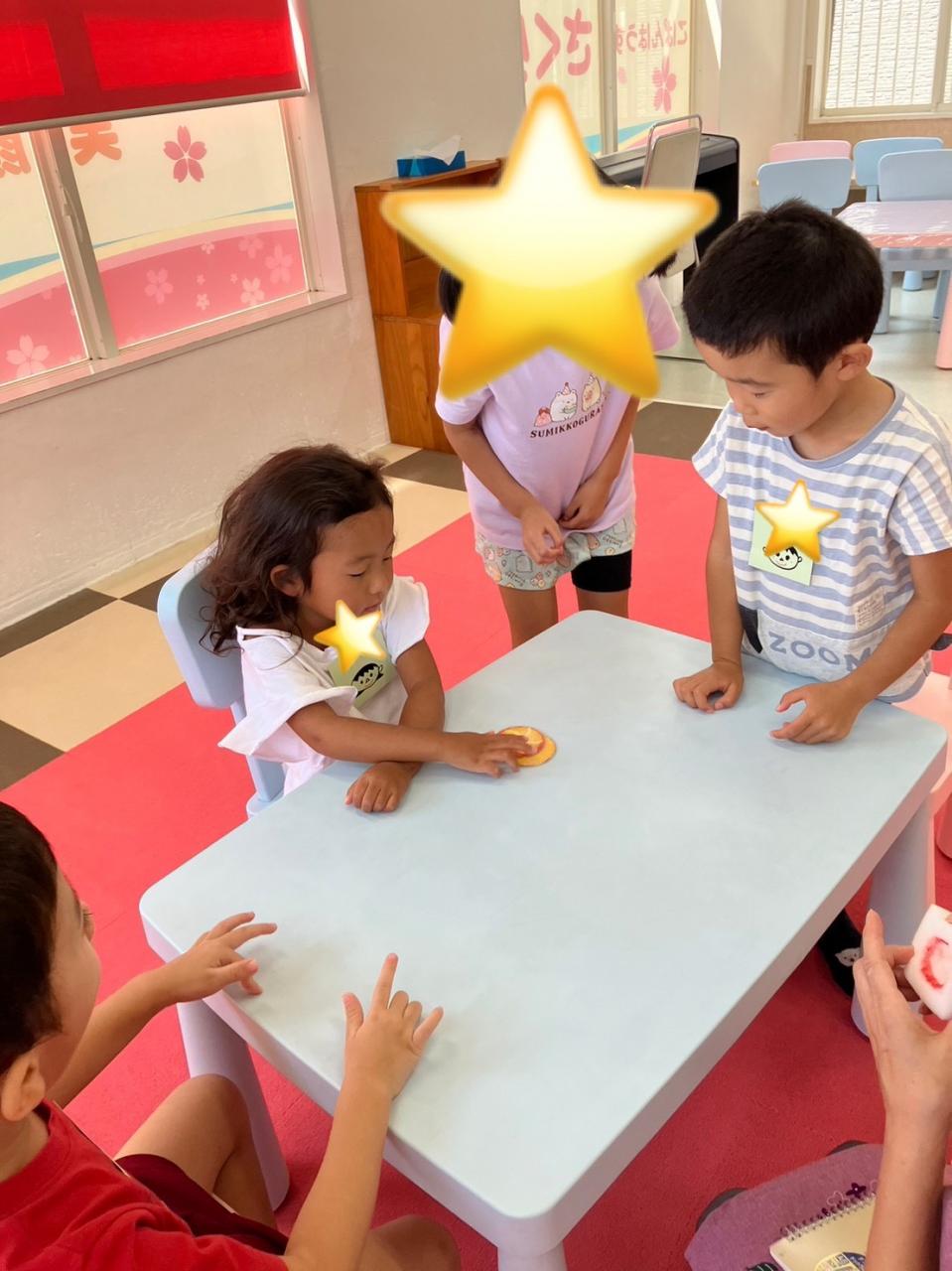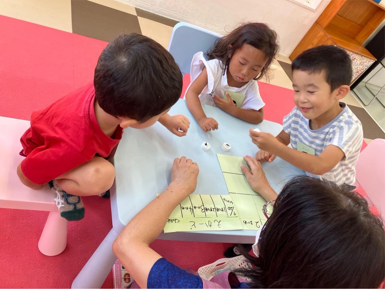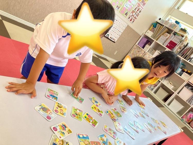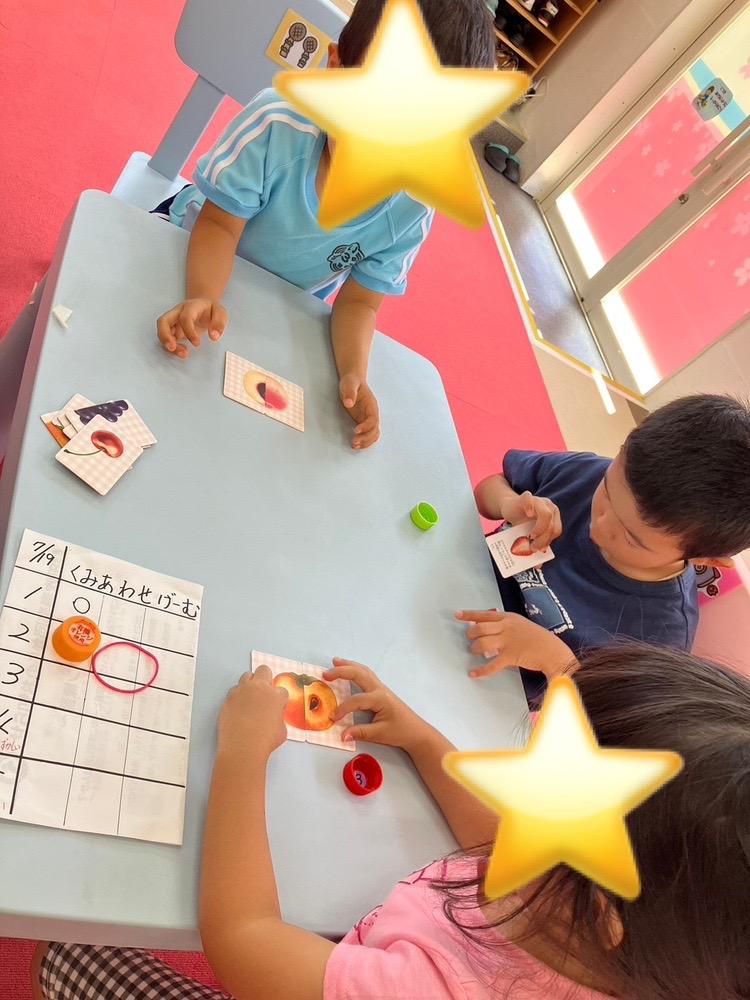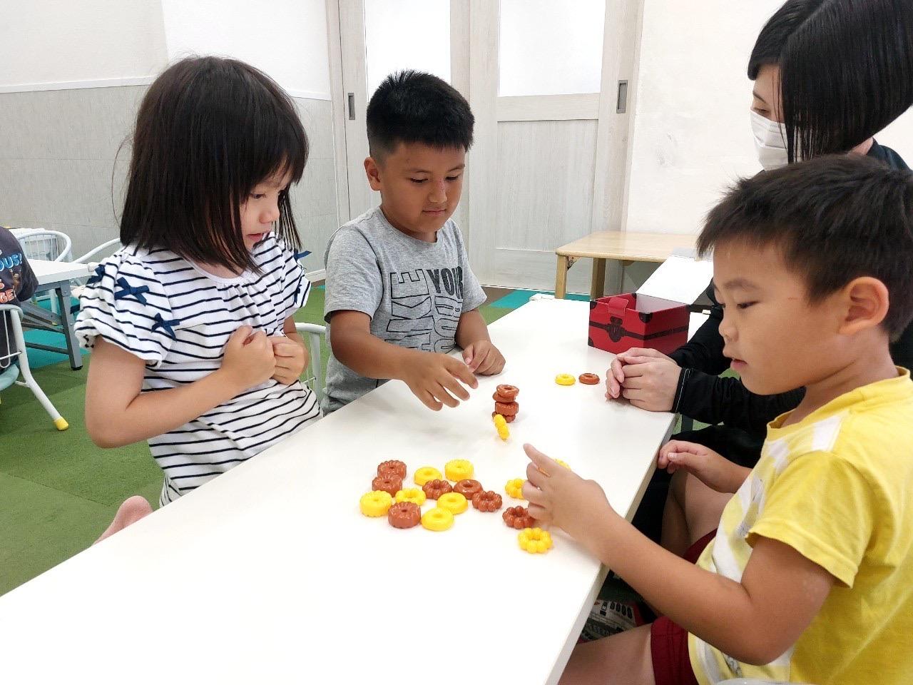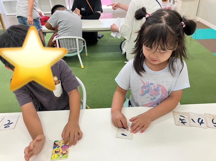 年長組は、順番を守ってドーナツを積むグループと、カルタを取った後、カルタの平仮名をなぞるグループにわかれてやりました。