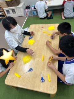 年長組は、順番を守って筒通し(決まった色に合わせて筒にゴムを通す)をやりました。